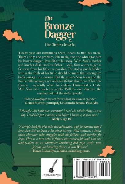 Twelve-year-old Samsuluna (Sam) needs to find his uncle. There's only one problem. His uncle, the one who gave him his bronze dagger, lives 800 miles away. With Sam's mother and brother dead, and his father... well, Sam wants to get as far away from his father as possible. The stolen jewels hidden within the folds of his tunic should be more than enough to book passages on a caravan. But the secrets Sam keeps and the lies he tells endanger not only his life but also those of his new friends... especially when he violates Hammurabi's Code. Will Sam ever reach his uncle? Will he ever discover the mystery behind the stolen jewels?
