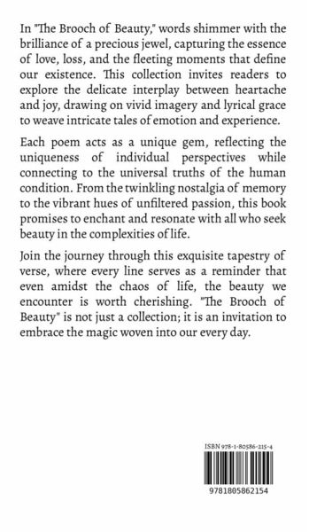 In "The Brooch of Beauty," words shimmer with the brilliance of a precious jewel, capturing the essence of love, loss, and the fleeting moments that define our existence. This collection invites readers to explore the delicate interplay between heartache and joy, drawing on vivid imagery and lyrical grace to weave intricate tales of emotion and experience. Each poem acts as a unique gem, reflecting the uniqueness of individual perspectives while connecting to the universal truths of the human condition. From the twinkling nostalgia of memory to the vibrant hues of unfiltered passion, this book promises to enchant and resonate with all who seek beauty in the complexities of life. Join the journey through this exquisite tapestry of verse, where every line serves as a reminder that even amidst the chaos of life, the beauty we encounter is worth cherishing. "The Brooch of Beauty" is not just a collection; it is an invitation to embrace the magic woven into our every day.