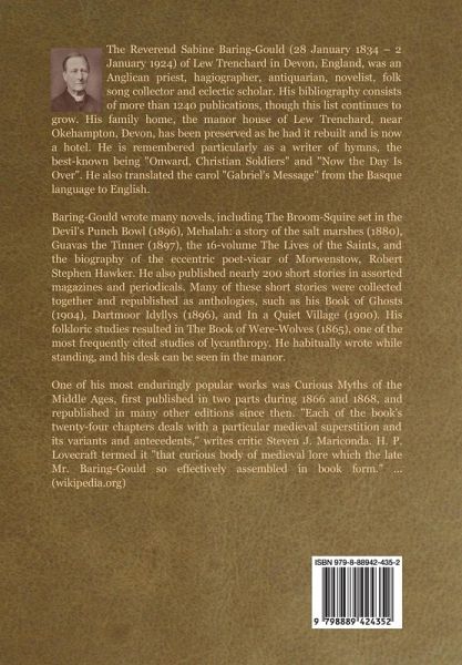 I confess to reading this book as part of my research into the location, and broomsquires, but I absolutely loved the story. Accepting that it is very much of its time, the effective evocation of place, and the sharp focus on character meant that the I found the simple plot to be gripping throughout the book. Yes, it is depressing, and has a Hardyesque foreboding, but it is beautifully crafted, and for someone who grew up wandering the paths in the bottom of the Devil's Punch Bowl, and seeking the sailor's stone up on the old road, it was a joy. (Chris Malone) About the author The Reverend Sabine Baring-Gould (28 January 1834 - 2 January 1924) of Lew Trenchard in Devon, England, was an Anglican priest, hagiographer, antiquarian, novelist, folk song collector and eclectic scholar. His bibliography consists of more than 1240 publications, though this list continues to grow. His family home, the manor house of Lew Trenchard, near Okehampton, Devon, has been preserved as he had it rebuilt and is now a hotel. He is remembered particularly as a writer of hymns, the best-known being "Onward, Christian Soldiers" and "Now the Day Is Over". He also translated the carol "Gabriel's Message" from the Basque language to English. Baring-Gould wrote many novels, including The Broom-Squire set in the Devil's Punch Bowl (1896), Mehalah: a story of the salt marshes (1880), Guavas the Tinner (1897), the 16-volume The Lives of the Saints, and the biography of the eccentric poet-vicar of Morwenstow, Robert Stephen Hawker. He also published nearly 200 short stories in assorted magazines and periodicals. Many of these short stories were collected together and republished as anthologies, such as his Book of Ghosts (1904), Dartmoor Idyllys (1896), and In a Quiet Village (1900). His folkloric studies resulted in The Book of Were-Wolves (1865), one of the most frequently cited studies of lycanthropy. He habitually wrote while standing, and his desk can be seen in the manor. One of his most enduringly popular works was Curious Myths of the Middle Ages, first published in two parts during 1866 and 1868, and republished in many other editions since then. "Each of the book's twenty-four chapters deals with a particular medieval superstition and its variants and antecedents," writes critic Steven J. Mariconda. H. P. Lovecraft termed it "that curious body of medieval lore which the late Mr. Baring-Gould so effectively assembled in book form." ... (wikipedia.org)
