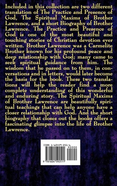 Included in this collection are two different translation of The Practice and Presence of God, The Spiritual Maxims of Brother Lawrence, and a short Biography of Brother Lawrence. The Practice and Presence of God is one of the most beautiful and touching stories of Christian devotion ever written. Brother Lawrence was a Carmelite Brother known for his profound peace and deep relationship with God; many came to seek spiritual guidance from him. The wisdom that he passed on to them, in conversations and in letters, would later become the basis for the book. These two translations will help the reader find a more complete understanding of this wonderful and enduring story. The Spiritual Maxims of Brother Lawrence are beautifully spiritual teachings that can help anyone have a closer relationship with God. And the short biography that closes out the books offers a fascinating glimpse into the life of Brother Lawrence.