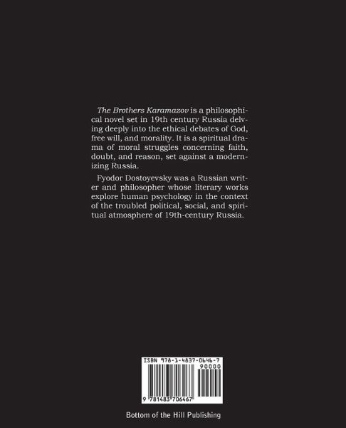 The Brothers Karamazov is a philosophical novel set in 19th century Russia delving deeply into the ethical debates of God, free will, and morality. It is a spiritual drama of moral struggles concerning faith, doubt, and reason, set against a modernizing Russia. Fyodor Dostoyevsky was a Russian writer and philosopher whose literary works explore human psychology in the context of the troubled political, social, and spiritual atmosphere of 19th-century Russia.