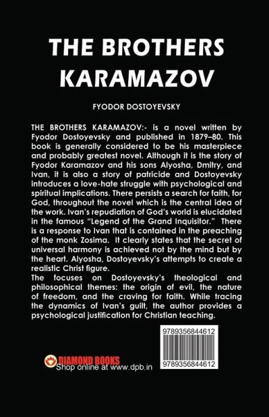 THE BROTHERS KARAMAZOV:- is a novel written by Fyodor Dostoyevsky and published in 1879-80. This book is generally considered to be his masterpiece and probably greatest novel. Although it is the story of Fyodor Karamazov and his sons Alyosha, Dmitry, and Ivan, it is also a story of patricide and Dostoyevsky introduces a love-hate struggle with psychological and spiritual implications. There persists a search for faith, for God, throughout the novel which is the central idea of the work. Ivan's repudiation of God's world is elucidated in the famous "Legend of the Grand Inquisitor." There is a response to Ivan that is contained in the preaching of the monk Zosima. It clearly states that the secret of universal harmony is achieved not by the mind but by the heart. Alyosha, Dostoyevsky's attempts to create a realistic Christ figure. The focuses on Dostoyevsky's theological and philosophical themes: the origin of evil, the nature of freedom, and the craving for faith. While tracing the dynamics of Ivan's guilt, the author provides a psychological justification for Christian teaching.