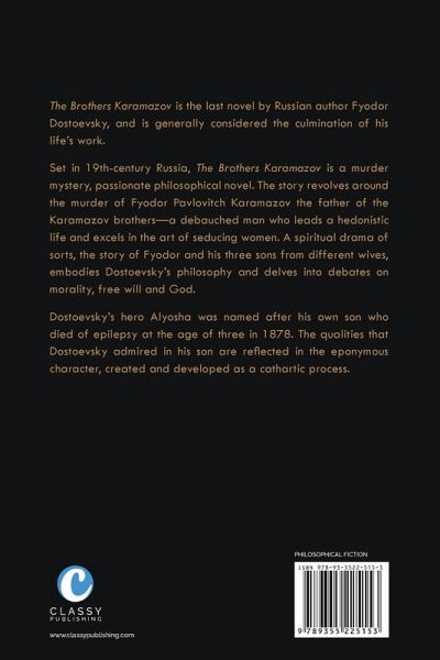 The Brothers Karamazov is the last novel by Russian author Fyodor Dostoevsky, and is generally considered the culmination of his life's work. Set in 19th-century Russia, The Brothers Karamazov is a murder mystery, passionate philosophical novel. The story revolves around the murder of Fyodor Pavlovitch Karamazov the father of the Karamazov brothers-a debauched man who leads a hedonistic life and excels in the art of seducing women. A spiritual drama of sorts, the story of Fyodor and his three sons from different wives, embodies Dostoevsky's philosophy and delves into debates on morality, free will and God. Dostoevsky's hero Alyosha was named after his own son who died of epilepsy at the age of three in 1878. The qualities that Dostoevsky admired in his son are reflected in the eponymous character, created and developed as a cathartic process.