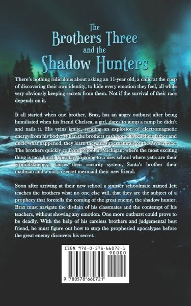 There’s nothing ridiculous about asking an 11-year old, a child at the cusp of discovering their own identity, to hide every emotion they feel, all while very obviously keeping secrets from them. Not if the survival of their race depends on it. It all started when one brother, Brax, has an angry outburst after being humiliated when his friend Chelsea, a girl, dares to jump a ramp he didn’t and nails it. His veins ignite, sending an explosion of electromagnetic energy from his body. When the brothers rush home to tell their father and uncle what happened, they learn they are supernaturals of the Psyner race. The brothers quickly go from school in Michigan, where the most exciting thing is taco lunch Tuesday, to going to a new school where yetis are their groundskeepers, fairies their security system, Santa’s brother their mailman and a not so secret mermaid their new friend. Soon after arriving at their new school a sinister schoolmate named Jett teaches the brothers what no one else will, that they are the subject of a prophecy that foretells the coming of the great enemy, the shadow hunter. Brax must navigate the disdain of his classmates and the contempt of his teachers, without showing any emotion. One more outburst could prove to be deadly. With the help of his careless brothers and judgemental best friend, he must figure out how to stop the prophesied apocalypse before the great enemy discovers his secret.