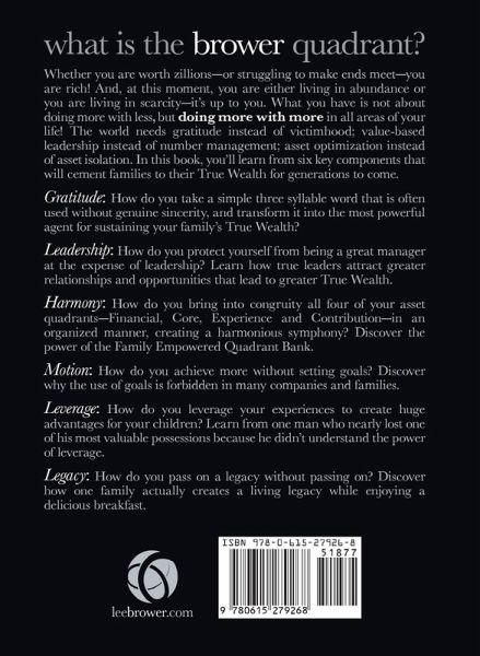 Whether You Are Worth Zillions or Struggling To Make Ends Meet, You Are Rich. An abundant life isn't defined by how much you acquire. What you have is not about doing more with less but doing more with more in all areas of your life. The world needs gratitude instead of victimhood; value-based leadership instead of number management; asset optimization instead of asset isolation. In The Brower Quadrant, discover how one family creates a living legacy while enjoying a delicious breakfast. Inside, you'll learn from six key components that will cement families to their True Wealth for generations to come. ¿Gratitude: How do you take a simple three-syllable word that is often used without genuine sincerity and transform it into the most powerful agent for sustaining your family's True Wealth? Leadership: How do you protect yourself from being a great manager at the expense of leadership? Learn how true leaders attract greater relationships and opportunities that lead to greater True Wealth. Harmony: How do you bring into congruity all four of your asset quadrants-Financial, Core, Experience, and Contribution-in an organized manner, creating a harmonious symphony? Discover the power of the Family Empowered Quadrant Bank. Motion: How do you achieve more without setting goals? Discover why the use of goals is forbidden in many companies and families. Leverage: How do you leverage your experiences to create huge advantages for your children? Learn from one man who nearly lost one of his most valuable possessions because he didn't understand the power of leverage. Legacy: How do you pass on a legacy without passing on? Are you currently living life in abundance, or are you living in scarcity? The choice is yours. Decide to live your richest life starting today!