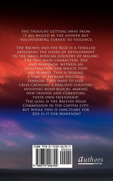 The Brown and the Blue is a thriller exploring the issues of development in the small African country of Malawi. The two main characters Zoe and Mawenda, witness an assassination for which they are blamed. This is during a time of extreme political tension. They have to flee, criss-crossing a parched country, avoiding road-blocks, making new friends and cementing their own friendship.The goal is the British High Commission in the capitol city. But while this is sanctuary for Zoe, is it for Mawenda?