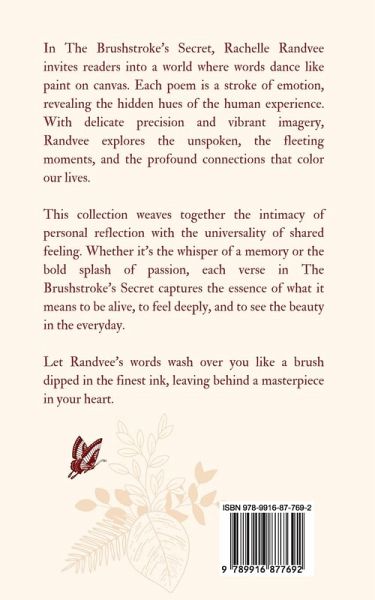 In The Brushstroke's Secret, Rachelle Randvee invites readers into a world where words dance like paint on canvas. Each poem is a stroke of emotion, revealing the hidden hues of the human experience. With delicate precision and vibrant imagery, Randvee explores the unspoken, the fleeting moments, and the profound connections that color our lives. This collection weaves together the intimacy of personal reflection with the universality of shared feeling. Whether it's the whisper of a memory or the bold splash of passion, each verse in The Brushstroke's Secret captures the essence of what it means to be alive, to feel deeply, and to see the beauty in the everyday. Let Randvee's words wash over you like a brush dipped in the finest ink, leaving behind a masterpiece in your heart. Copyright © 2024 Book Fairy Publishing