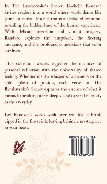 In The Brushstroke's Secret, Rachelle Randvee invites readers into a world where words dance like paint on canvas. Each poem is a stroke of emotion, revealing the hidden hues of the human experience. With delicate precision and vibrant imagery, Randvee explores the unspoken, the fleeting moments, and the profound connections that color our lives. This collection weaves together the intimacy of personal reflection with the universality of shared feeling. Whether it's the whisper of a memory or the bold splash of passion, each verse in The Brushstroke's Secret captures the essence of what it means to be alive, to feel deeply, and to see the beauty in the everyday. Let Randvee's words wash over you like a brush dipped in the finest ink, leaving behind a masterpiece in your heart. Copyright © 2024 Book Fairy Publishing