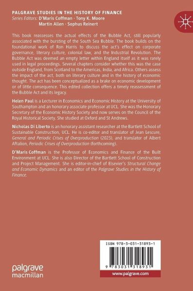 Introduction.- The Bubble Act and the First Corporate Economy.- 'Mr Morice is said to appear at the head': The Bubble Act and an Aborted Joint-Stock Slave-Trading Company.- 'That ever-memorable year of epidemical infatuation': Incorporation, the Jamaica Mines Company, and the Bubble Act of 1720.- Pamphlet Poetry and the South Sea Bubble.- Decoding the Bubble: Popular Magic, Financial Deception, and Eliza Haywood's Memoirs of a Certain Island Adjacent to Utopia.- Consequences Unintended: The Bubble Act and American Independence.- Capitalism by Generalists: The Governance of the Ayr Bank and the Emergence of Professionalism in Mid-Eighteenth-Century Scottish Banking.- Royal Charters, Royal Power, and the Business of Empire.- Babbage's Age of Speculation: Calculating the Value of Life After the Repeal of the Bubble Act.- The Repeal of the Bubble Act and the Debate Between the Currency School and the Banking School.- Agency Houses in Bengal and the Indigo Bubble.- Epilogue.