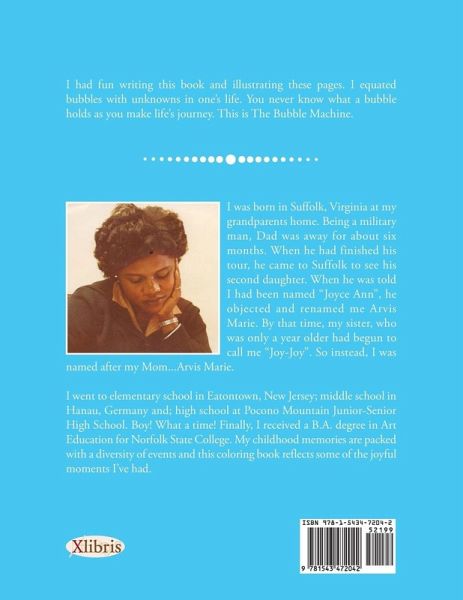 I was born in Suffolk, Virginia at my grandparents home. Being a military man, Dad was away for about six months. When he had finished his tour, he came to Suffolk to see his second daughter. When he was told I had been named "Joyce Ann", he objected and renamed me Arvis Marie. By that time, my sister, who was only a year older had begun to call me "Joy-Joy". So instead, I was named after my Mom...Arvis Marie. I went to elementary school in Eatontown, New Jersey; middle school in Hanau, Germany and; high school at Pocono Mountain Junior-Senior High School. Boy! What a time! Finally, I received a B.A. degree in Art Education for Norfolk State College. My childhood memories are packed with a diversity of events and this coloring book reflects some of the joyful moments I've had.