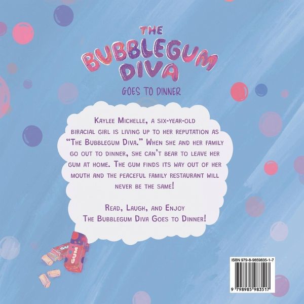 The Bubblegum Diva Goes to Dinner! Kaylee Michelle, a six-year-old biracial girl is living up to her reputation as "The Bubblegum Diva." When she and her family go out to dinner, she can't bear to leave her gum at home. The gum finds its way out of her mouth and the peaceful family restaurant will never be the same! Read, Laugh, and Enjoy! This book features: -Expanded Vocabulary -Kid-Friendly Glossary -Rhyming Word Recognition -Diversity -Family Time -Forgiveness -Recovering from your mistakes This book will provide lots of laughs and help your child develop a love of reading!