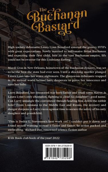 The Buchanan Bastard: A Gripping Thriller of Murder, Secrets, and Survival by Dedra L. Stevenson. Louisiana debutante Laura Lynn Beauford has it all: wealth, prestige, and the promise of a bright future married to millionaire Brian Buchanan. But in the glittering world of 1970s New Orleans, a shocking murder during Mardi Gras unravels everything. Wrongfully accused and imprisoned, Laura Lynn faces a desperate fight to clear her name and save the life of her unborn child-all while the real killer roams free. Her only hope lies in her father, Larry Beauford, a decorated war hero and respected small-town mayor. Driven by love and haunted by the need for justice, Larry dives headfirst into a web of dark secrets, family betrayals, and powerful enemies. From the backrooms of Louisiana's high society to covert dealings in the Middle East and Russia, Larry uncovers layers of deception that threaten not only his daughter's life but his own. As Laura Lynn's time runs out, The Buchanan Bastard races toward a breathtaking conclusion that will leave readers questioning who they can trust and the lengths they'd go to protect the ones they love. A suspenseful tale of family loyalty, betrayal, and survival, The Buchanan Bastard was named RAK Book Club's Book of the Year 2022.