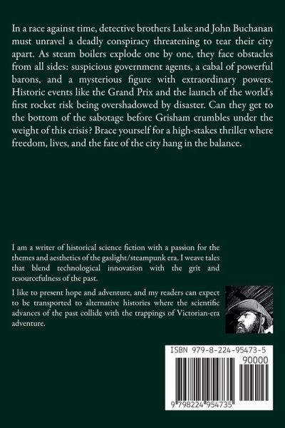 In a race against time, detective brothers Luke and John Buchanan must unravel a deadly conspiracy threatening to tear their city apart. As steam boilers explode one by one, they face obstacles from all sides: suspicious government agents, a cabal of powerful barons, and a mysterious figure with extraordinary powers. Historic events like the Grand Prix and the launch of the world's first rocket risk being overshadowed by disaster. Can they get to the bottom of the sabotage before Grisham crumbles under the weight of this crisis? Brace yourself for a high-stakes thriller where freedom, lives, and the fate of the city hang in the balance.