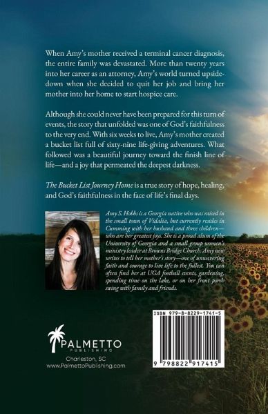 When Amy's mother created her final bucket list, no one could have guessed how much healing it would bring. Sometimes, the greatest miracles happen in the most unexpected ways, and God shows His faithfulness even as life nears its end. Amy S. Hobbs was a successful attorney in her home state of Georgia when her mother received a surprising diagnosis: stage IV pancreatic cancer, with six weeks to live. After leaving her job and bringing her mother into her home to start hospice care, the family was left with a simple question: What's the next best step? While deciding how best to live out the remainder of her life, Amy's mother came up with a bucket list of all the things she desired to do. With sixty-nine items on her list, Amy's mother and her family set out on a season of life-giving adventures. Family and friends rallied together. Forgiveness was extended, and broken relationships restored. And Amy's family found the courage and strength in Christ to face the inevitable with grace and joy. This memoir is a sweet reminder of God's goodness and unconditional love, and it is the perfect gift for anyone facing grief, loss, or terminal illness with their loved ones. Filled with powerful stories and heart-healing metaphors, The Bucket List Journey Home is a testament of God's tremendous faithfulness in seasons of trial-from the support of Amy's family and friends to the unwavering faith and courage of a woman who loved Jesus with all her heart.