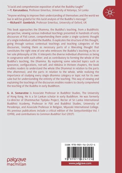 This book approaches the Dhamma, the Buddha's teaching, from a Buddhistic perspective, viewing various individual teachings presented in hundreds of early discourses of Pali canon, comprehending them under a single systemic thought of a single individual called the Buddha. It explicates the structure of this thought, going through various contextual teachings and teaching categories of the discourses, treating them as necessary parts of a liberating thought that constitutes the right view of one who embraces the Buddha's teaching as his or her sole philosophy of life. It interprets the diverse individual dhammas as being in congruence with each other; and as contributory to forming the whole of the Buddha's teaching, the Dhamma. By exploring some selected topics such as ignorance, configurations, not-self, and nibbana in thirteen chapters, the book enables readers to understand the whole (the Dhamma) in relation to the parts (the dhammas), and the parts in relation to the whole, while realizing the importance of studying every single dhamma category or topic not for its own sake but for understand the entirety of the teaching. This way of viewing and explaining the teachings of the discourses enables readers to clearly comprehend the teaching of the Buddha in early Buddhism.