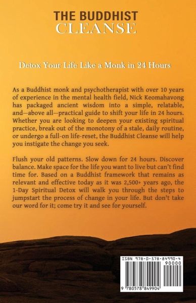 Detox Your Life Like a Monk in 24 Hours As a Buddhist monk and psychotherapist with over 10 years of experience in the mental health field, Nick Keomahavong has packaged ancient wisdom into a simple, relatable, and-above all-practical guide to shift your life in 24 hours. Whether you are looking to deepen your existing spiritual practice, break out of the monotony of a stale, daily routine, or undergo a full-on life-reset, the Buddhist Cleanse will help you instigate the change you seek. Flush your old patterns. Slow down for 24 hours. Discover balance. Make space for the life you want to live but can't find time for. Based on a Buddhist framework that remains as relevant and effective today as it was when it was first practiced 2,500+ years ago, the 1-Day Spiritual Detox will walk you through the steps to jumpstart the process of change in your life. But don't take our word for it, come try it and see for yourself.