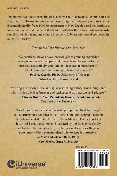 The Buenavida America continues to follow The Buenavida Dilemma and The Death of the Brown Americano by describing the trials and successes of the Buenavida family from 1900 to the present in New Mexico and the southwest in general. A central theme of the book is whether Hispanics must necessarily sacrifice their language and culture in order to fully assimilate and be successful in the U.S. society. Praise for The Buenavida America ?Generational novels have that rare gift of granting the reader insights into one?s own past and future. José Uranga performs that task exceedingly well, adding the pleasant placement of the Buenavidas into meaningful historical context.? ?Paul A. García, Ph.D, University of Kansas, School of Education, retired ?Sharing a life story is not as easy as just telling a story. José Uranga does this with historical references and background that intrigue and educate.? ?Rebecca Dukes, Vice-President, University Advancement, San José State University ?José Uranga does a fine job providing important food for thought in The Buenavida America and his book highlights poignant cultural threads imbedded in the history of New Mexico. The fictional yet historical based ?testimonios? illustrated by the Buenavida family shed light on the complexities, challenges, and victories Hispanics experience while traversing identity in present day America.? ?Maria Martínez Bain, Ph.D, New Mexico State University