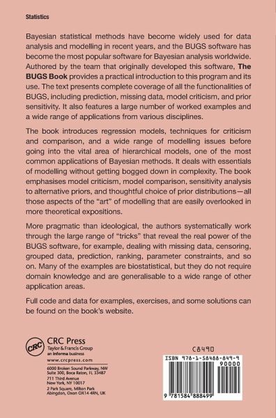 Bayesian statistical methods have become widely used for data analysis and modelling in recent years, and the BUGS software has become the most popular software for Bayesian analysis worldwide. Authored by the team that originally developed this software, The BUGS Book provides a practical introduction to this program and its use. The text presents complete coverage of all the functionalities of BUGS, including prediction, missing data, model criticism, and prior sensitivity. It also features a large number of worked examples and a wide range of applications from various disciplines.