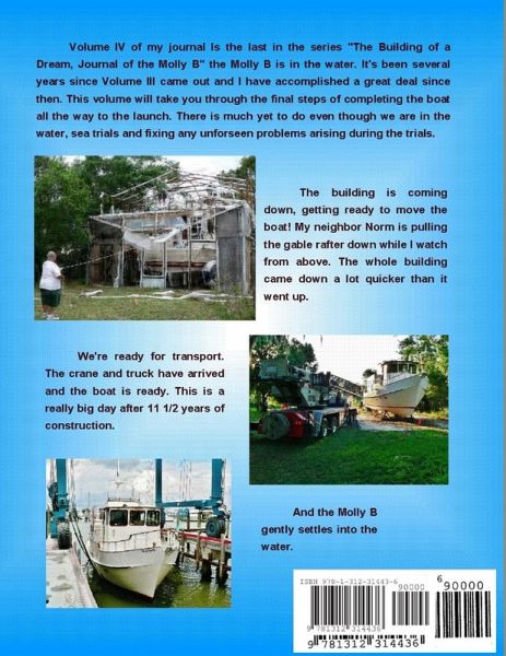 This is the fourth volume in a series of journals detailing my experiences building a 43 Foot Trawler in the backyard. This is my personal journal of the trials and tribulations I encountered during the construction of the Molly B. It was my dream to own a boat my wife and I could live aboard and these journals explain how I went about accomplishing that dream. It wasn't an easy task and it took me almost 12 years to complete my project but I did finally complete and launch the Molly B and now we are living our dream on the water.