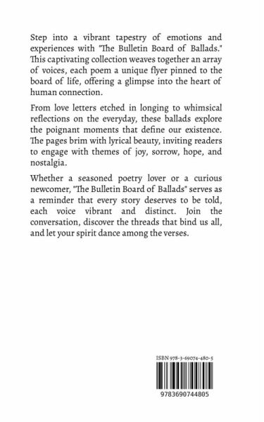 Step into a vibrant tapestry of emotions and experiences with "The Bulletin Board of Ballads." This captivating collection weaves together an array of voices, each poem a unique flyer pinned to the board of life, offering a glimpse into the heart of human connection. From love letters etched in longing to whimsical reflections on the everyday, these ballads explore the poignant moments that define our existence. The pages brim with lyrical beauty, inviting readers to engage with themes of joy, sorrow, hope, and nostalgia. Whether a seasoned poetry lover or a curious newcomer, "The Bulletin Board of Ballads" serves as a reminder that every story deserves to be told, each voice vibrant and distinct. Join the conversation, discover the threads that bind us all, and let your spirit dance among the verses.
