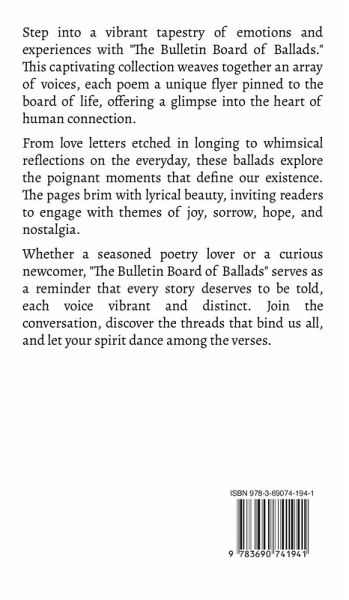 Step into a vibrant tapestry of emotions and experiences with "The Bulletin Board of Ballads." This captivating collection weaves together an array of voices, each poem a unique flyer pinned to the board of life, offering a glimpse into the heart of human connection. From love letters etched in longing to whimsical reflections on the everyday, these ballads explore the poignant moments that define our existence. The pages brim with lyrical beauty, inviting readers to engage with themes of joy, sorrow, hope, and nostalgia. Whether a seasoned poetry lover or a curious newcomer, "The Bulletin Board of Ballads" serves as a reminder that every story deserves to be told, each voice vibrant and distinct. Join the conversation, discover the threads that bind us all, and let your spirit dance among the verses.