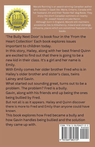 'The Bully Next Door' is book four from the 'From the Heart Collection'. Each book stands alone. In this book, Hailey, along with her best friend Quinn are excited to find out that there is going to be a new girl in their class and her name is Emily. Emily also has an older brother named Fred who is in Hailey's older brother and sister's class. These are twins named Gavin and Lainey. Sounds like fun, but there is a problem. Fred is a bully. Gavin, along with his friends end up being the ones bullied by Fred. But, not everything is as it appears. Hailey and Quinn discover there is more to Fred and Emily than anyone could have known. The Bully Next Door shows how Fred became a bully and how Gavin handles being bullied along with the solution they came up with. Maryte Running is an award-winning author.