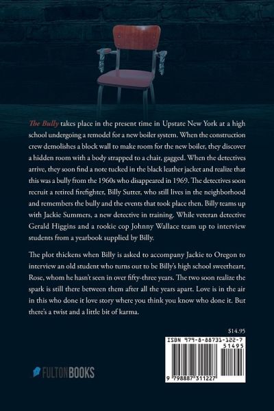 The Bully takes place in the present time in Upstate New York at a high school undergoing a remodel for a new boiler system. When the construction crew demolishes a block wall to make room for the new boiler, they discover a hidden room with a body strapped to a chair, gagged. When the detectives arrive, they soon find a note tucked in the black leather jacket and realize that this was a bully from the 1960s who disappeared in 1969. The detectives soon recruit a retired firefighter, Billy Sutter, who still lives in the neighborhood and remembers the bully and the events that took place then. Billy teams up with Jackie Summers, a new detective in training. While veteran detective Gerald Higgins and a rookie cop Johnny Wallace team up to interview students from a yearbook supplied by Billy. The plot thickens when Billy is asked to accompany Jackie to Oregon to interview an old student who turns out to be Billy's high school sweetheart, Rose, whom he hasn't seen in over fifty-three years. The two soon realize the spark is still there between them after all the years apart. Love is in the air in this who done it love story where you think you know who done it. But there's a twist and a little bit of karma.