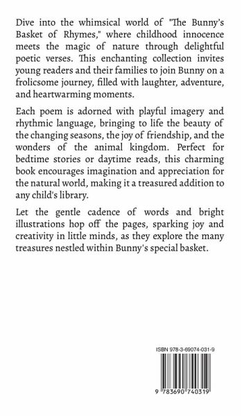Dive into the whimsical world of "The Bunny's Basket of Rhymes," where childhood innocence meets the magic of nature through delightful poetic verses. This enchanting collection invites young readers and their families to join Bunny on a frolicsome journey, filled with laughter, adventure, and heartwarming moments. Each poem is adorned with playful imagery and rhythmic language, bringing to life the beauty of the changing seasons, the joy of friendship, and the wonders of the animal kingdom. Perfect for bedtime stories or daytime reads, this charming book encourages imagination and appreciation for the natural world, making it a treasured addition to any child's library. Let the gentle cadence of words and bright illustrations hop off the pages, sparking joy and creativity in little minds, as they explore the many treasures nestled within Bunny's special basket.
