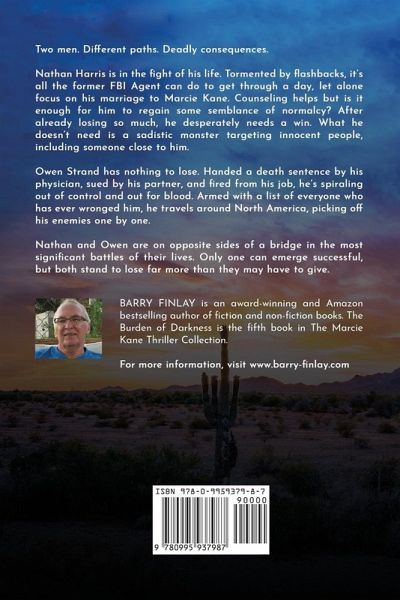 "...this is an action thriller done right..." - The Prairies Book ReviewFBI Agent Nathan Harris is in the fight of his life.Tormented by flashbacks, it's all the former FBI Agent can do to get through a day, let alone focus on his marriage to Marcie Kane. Counseling helps but is it enough to help him regain some semblance of normalcy? After losing so much already, he desperately needs a win. What he doesn't need is a sadistic monster targeting innocent people, including someone close to him.Owen Strand has nothing to lose.Handed a death sentence by his physician, sued by his partner and fired from his job, he's spiraling out of control and out for blood. Armed with a list of everyone who has ever wronged him, he travels around North America, picking off his enemies one by one.Nathan and Owen are on opposite sides of a bridge in the most significant battles of their lives. Only one can emerge successful, but both stand to lose far more than they may have to give.The Burden of Darkness is written by one of the Authors Show's "50 Great Writers You Should Be Reading" list in 2012 and the winner of multiple literary awards.Scroll up to grab your copy of The Burden of Darkness today!