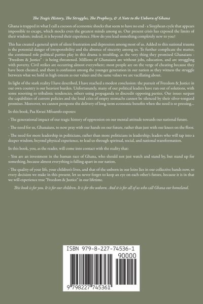 The Tragic History, The Struggles, The Prophecy, & A Note to the Unborn of Ghana Ghana is trapped in what I call a cocoon of economic shocks that seem to have no end - a Sisyphean cycle that appears impossible to escape, which mocks even the greatest minds among us. Our present crisis has exposed the limits of their wisdom; indeed, it is beyond their experience. How do you lead something completely new to you? This has created a general spirit of silent frustration and depression among most of us. Added to this national trauma is the potential danger of irresponsibility and the absence of sincerity among us. To further complicate the matter, the continued role political parties play in this drama is troubling, as the very thing they promised Ghanaians - "Freedom & Justice" - is being threatened. Millions of Ghanaians are without jobs, education, and are struggling with poverty. Civil strikes are occurring almost everywhere; most people are on the verge of cheating because they have been cheated, and there is confusion among the younger generation in our nation as they witness the struggle between what we hold in high esteem as our values and the same values we are vacillating about. In light of the stark reality I have described, I have reached a modest conclusion: the pursuit of Freedom & Justice in our own country is our heaviest burden. Unfortunately, many of our political leaders have run out of solutions, with some resorting to tribalistic tendencies, others using propaganda to discredit opposing parties. Our issues surpass the capabilities of current policies and the loud cries of empty stomachs cannot be silenced by their silver-tongued promises. Moreover, we cannot postpone the delivery of long-term economic benefits when the need is so pressing... In this book, Paa Kwasi Mfoamfo exposes: - The generational impact of our tragic history of oppression on our mental attitude towards our national future. - The need for us, Ghanaians, to now pray with our hands on our future, rather than just with our knees on the floor. - The need for more leadership in politicians, rather than more politicians in leadership; leaders who will tap into a deeper wisdom, beyond physical experience, to lead us through spiritual, social, and national transformation. In this book, you, as the reader, will come into contact with the reality that: - You are an investment in the human race of Ghana, who should not just watch and stand by, but stand up for something, because almost everything is falling apart in our nation. - The quality of your life, your children's lives, and that of the unborn in our loins lies in our collective hands now, so every decision we make in this present, let us never forget to keep an eye on each other's future, because it is in that we will experience true "Freedom & Justice" in our lifetime. This book is for you. It is for our children. It is for the unborn. And it is for all of us who call Ghana our homeland.
