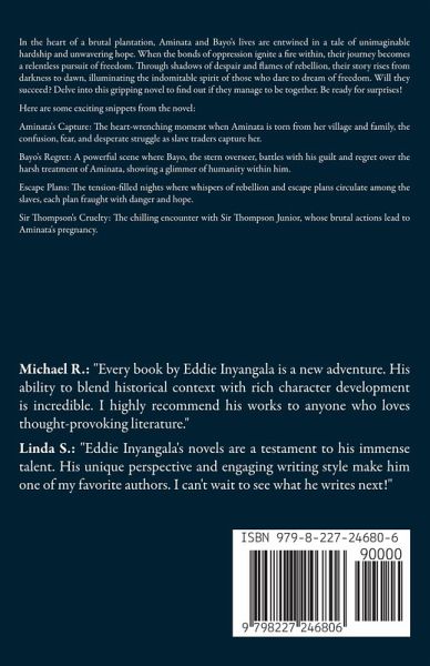 In the heart of a brutal plantation, Aminata and Bayo's lives are entwined in a tale of unimaginable hardship and unwavering hope. When the bonds of oppression ignite a fire within, their journey becomes a relentless pursuit of freedom. Through shadows of despair and flames of rebellion, their story rises from darkness to dawn, illuminating the indomitable spirit of those who dare to dream of freedom. Will they succeed? Delve into this gripping novel to find out if they manage to be together. Be ready for surprises! Here are some exciting snippets from the novel: Aminata's Capture: The heart-wrenching moment when Aminata is torn from her village and family, the confusion, fear, and desperate struggle as slave traders capture her. Bayo's Regret: A powerful scene where Bayo, the stern overseer, battles with his guilt and regret over the harsh treatment of Aminata, showing a glimmer of humanity within him. Escape Plans: The tension-filled nights where whispers of rebellion and escape plans circulate among the slaves, each plan fraught with danger and hope. Sir Thompson's Cruelty: The chilling encounter with Sir Thompson Junior, whose brutal actions lead to Aminata's pregnancy.