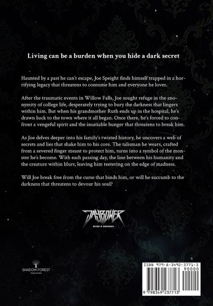 Living can be a burden when you hide a dark secret Haunted by a past he can't escape, Joe Speight finds himself trapped in a horrifying legacy that threatens to consume him and everyone he loves. After the traumatic events in Willow Falls, Joe sought refuge in the anonymity of college life, desperately trying to bury the darkness that lingers within him. But when his grandmother Ruth ends up in the hospital, he's drawn back to the town where it all began. Once there, he's forced to confront a vengeful spirit and the insatiable hunger that threatens to break him. As Joe delves deeper into his family's twisted history, he uncovers a web of secrets and lies that shake him to his core. The talisman he wears, crafted from a severed finger meant to protect him, turns into a symbol of the monster he's become. With each passing day, the line between his humanity and the creature within blurs, leaving him teetering on the edge of madness. Will Joe break free from the curse that binds him, or will he succumb to the darkness that threatens to devour his soul?