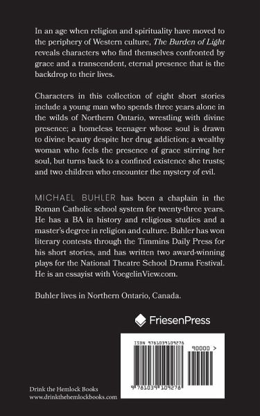 In an age when religion and spirituality have moved to the periphery of Western culture, The Burden of Light reveals characters who find themselves confronted by grace and a transcendent, eternal presence that is the backdrop to their lives. Characters in this collection of eight short stories include a young man who spends three years alone in the wilds of Northern Ontario, wrestling with divine presence; a homeless teenager whose soul is drawn to divine beauty despite her drug addiction; a wealthy woman who feels the presence of grace stirring her soul, but turns back to a confined existence she trusts; and two children who encounter the mystery of evil.