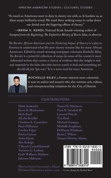 The Burden: African Americans and the Enduring Impact of Slavery is a plea to America to understand what life post-slavery remains like for many African Americans, who are descended from people whose unpaid labor built this land, but have had to spend the last century and a half carrying the dual burden of fighting racial injustice and rising above the lowered expectations and hateful bigotry that attempt to keep them shackled to that past. The Burden, edited by award-winning Detroit newspaper columnist Rochelle Riley, is a powerful collection of essays that create a chorus of evidence that the burden is real. As Nikole Hannah-Jones states in the book's foreword, "despite the fact that black Americans remain at the bottom of every indicator of well-being in this country-from wealth, to poverty, to health, to infant mortality, to graduation rates, to incarceration-we want to pretend that this current reality has nothing to do with the racial caste system that was legally enforced for most of the time the United States of America has existed." The Burden expresses the voices of other well-known Americans, such as actor/director Tim Reid who compares slavery to a cancer diagnosis, former Detroit News columnist Betty DeRamus who recounts the discrimination she encountered as a young black Detroiter in the south, and the actress Aisha Hinds who explains how slavery robbed an entire race of value and self-worth. This collection of essays is a response to the false idea that slavery wasn't so bad and something we should all just "get over." The descendants of slaves have spent over 150 years seeking permission to put this burden down. As Riley writes in her opening essay, "slavery is not a relic to be buried, but a wound that has not been allowed to heal. You cannot heal what you do not treat. You cannot treat what you do not see as a problem. And America continues to look the other way, to ask African Americans to turn the other cheek, to suppress our joy, to accept that we are supposed to go only as far as we are allowed." The Burden aims to address this problem. It is a must-read for every American.
