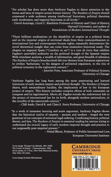 Despite the long history of debate and the recent resurgence of interest in empires and imperialism, no one seems very clear as to what exactly an empire is. The Burdens of Empire strives to offer not only a definition but also a working description. This book examines how empires were conceived by those who ruled them and lived under them; it looks at the relations, real or imagined, between the imperial metropolis (when one existed) and its outlying provinces or colonies; and it asks how the laws that governed the various parts and various ethnic groups, of which all empires were made, were conceived and interpreted. Anthony Pagden argues that the evolution of the modern concept of the relationship between states, and in particular the modern conception of international law, cannot be understood apart from the long history of European empire building.