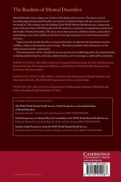 Mental disorders have a huge cost, both to individuals and to society. The direct costs of providing appropriate mental healthcare must be considered along with the societal costs of not doing so. This volume uses the findings of the WHO Mental Health surveys, a long-term study with more than 120,000 people from 24 countries, to present a comprehensive portrait of the burden of mental disorders. The most up-to-date measures, field procedures and analysis methodology were used and the results have been rigorously peer-reviewed and assessed for accuracy. Topics covered include the effects of mental disorders on educational attainment, marital stability, violence, absenteeism, earnings, and the disability they cause. The book also discusses the implications for policy and practice. This information will be valuable for anyone involved in establishing policy for mental health, including epidemiologists, clinicians, administrators, service managers and health economists.