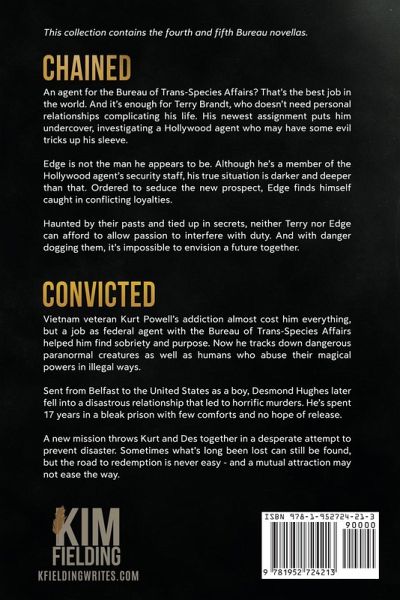 This collection contains the fourth and fifth Bureau novellas. CHAINED An agent for the Bureau of Trans-Species Affairs? That's the best job in the world. And it's enough for Terry Brandt, who doesn't need personal relationships complicating his life. His newest assignment puts him undercover, investigating a Hollywood agent who may have some evil tricks up his sleeve. Edge is not the man he appears to be. Although he's a member of the Hollywood agent's security staff, his true situation is darker and deeper than that. Ordered to seduce the new prospect, Edge finds himself caught in conflicting loyalties. Haunted by their pasts and tied up in secrets, neither Terry nor Edge can afford to allow passion to interfere with duty. And with danger dogging them, it's impossible to envision a future together. CONVICTED Vietnam veteran Kurt Powell's addiction almost cost him everything, but a job as federal agent with the Bureau of Trans-Species Affairs helped him find sobriety and purpose. Now he tracks down dangerous paranormal creatures as well as humans who abuse their magical powers in illegal ways. Sent from Belfast to the United States as a boy, Desmond Hughes later fell into a disastrous relationship that led to horrific murders. He's spent seventeen years in a bleak prison with few comforts and no hope of release. A new mission throws Kurt and Des together in a desperate attempt to prevent disaster. Sometimes what's long been lost can still be found, but the road to redemption is never easy-and a mutual attraction may not ease the way.