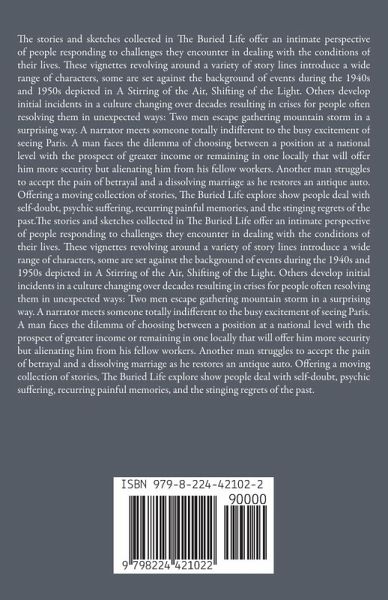 The stories and sketches collected in The Buried Life offer an intimate perspective of people responding to challenges they encounter in dealing with the conditions of their lives. These vignettes revolving around a variety of story lines introduce a wide range of characters, some are set against the background of events during the 1940s and 1950s depicted in A Stirring of the Air, Shifting of the Light. Others develop initial incidents in a culture changing over decades resulting in crises for people often resolving them in unexpected ways: Two men escape gathering mountain storm in a surprising way. A narrator meets someone totally indifferent to the busy excitement of seeing Paris. A man faces the dilemma of choosing between a position at a national level with the prospect of greater income or remaining in one locally that will offer him more security but alienating him from his fellow workers. Another man struggles to accept the pain of betrayal and a dissolving marriage as he restores an antique auto. Offering a moving collection of stories, The Buried Life explore show people deal with self-doubt, psychic suffering, recurring painful memories, and the stinging regrets of the past.The stories and sketches collected in The Buried Life offer an intimate perspective of people responding to challenges they encounter in dealing with the conditions of their lives. These vignettes revolving around a variety of story lines introduce a wide range of characters, some are set against the background of events during the 1940s and 1950s depicted in A Stirring of the Air, Shifting of the Light. Others develop initial incidents in a culture changing over decades resulting in crises for people often resolving them in unexpected ways: Two men escape gathering mountain storm in a surprising way. A narrator meets someone totally indifferent to the busy excitement of seeing Paris. A man faces the dilemma of choosing between a position at a national level with the prospect of greater income or remaining in one locally that will offer him more security but alienating him from his fellow workers. Another man struggles to accept the pain of betrayal and a dissolving marriage as he restores an antique auto. Offering a moving collection of stories, The Buried Life explore show people deal with self-doubt, psychic suffering, recurring painful memories, and the stinging regrets of the past.