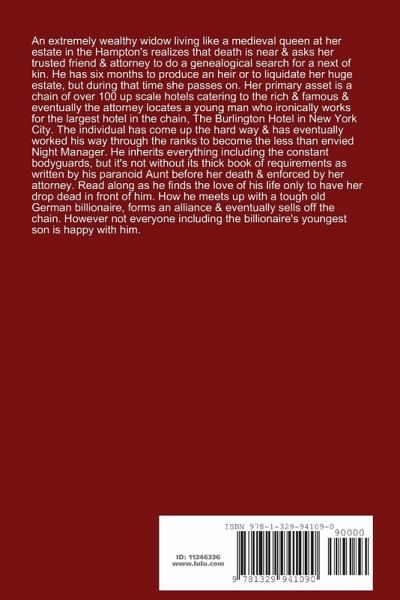 A young man unexpectedly inherits riches beyond belief, a chain of over 100 up scale hotels catering to only the rich & famous. But it comes with a stiff price, a large book of strict requirements as written by his paranoid Aunt before her death. Read along as he finds his soul mate only to have her die in front of him & how he sells off the hotel chain. But now everyone is happy about it & he now is forced to travel with bodyguards on his visits to his joint interests with a German billionaire in Europe.