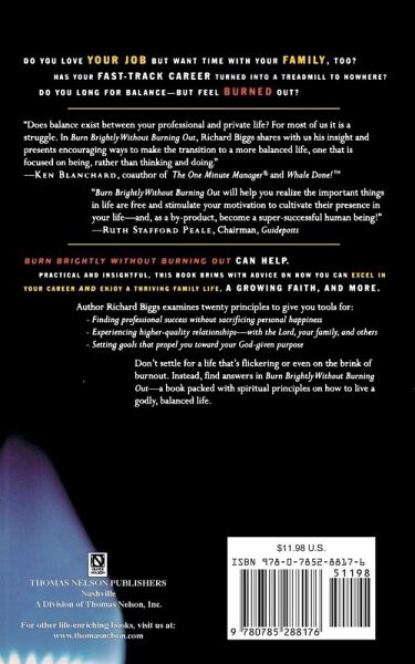 Are you burning brightly-or burning out-in your spiritual, mental, physical, and emotional life? Do you find yourself being torn between work and family? Between what you have to do and what you want to do? In Burn Brightly Without Burning Out, Richard K. Biggs examines twenty delicate contrasts we all face and urges readers to gradually improve the balance between work and the other aspects of life. Filled with examples and exercises, each brief chapter reveals timeless truths, offers practical application tips, and issues a call to action."I love the big message of this small book," writes John Maxwell in the foreword. "Whether you're struggling to find work/life balance, or seeking to better the quality of life you now enjoy, Richard can help."