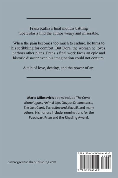 Franz Kafka's final months battling tuberculosis find the author weary and miserable. When the pain becomes too much to endure, he turns to his scribbling for comfort. But Dora, the woman he loves, harbors other plans. Franz's final work faces an epic and historic disaster even his imagination could not conjure. A tale of love, destiny, and the power of art.