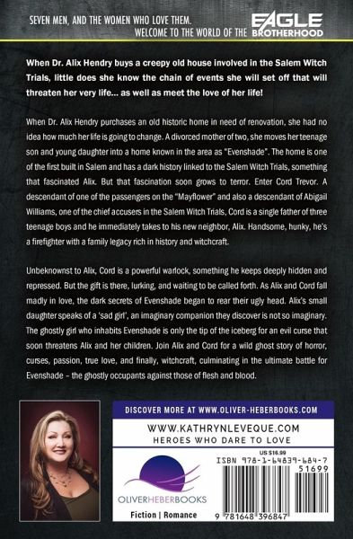 Seven men, and the women who love them. Welcome to the world of the Eagle Brotherhood... When Dr. Alix Hendry buys a creepy old house involved in the Salem Witch Trials, little does she know the chain of events she will set off that will threaten her very life... as well as meet the love of her life! When Dr. Alix Hendry purchases an old historic home in need of renovation, she had no idea how much her life is going to change. A divorced mother of two, she moves her teenage son and young daughter into a home known in the area as "Evenshade". The home is one of the first built in Salem and has a dark history linked to the Salem Witch Trials, something that fascinated Alix. But that fascination soon grows to terror. Enter Cord Trevor. A descendant of one of the passengers on the "Mayflower" and also a descendant of Abigail Williams, one of the chief accusers in the Salem Witch Trials, Cord is a single father of three teenage boys and he immediately takes to his new neighbor, Alix. Handsome, hunky, he's a firefighter with a family legacy rich in history and witchcraft. Unbeknownst to Alix, Cord is a powerful warlock, something he keeps deeply hidden and repressed. But the gift is there, lurking, and waiting to be called forth. As Alix and Cord fall madly in love, the dark secrets of Evenshade began to rear their ugly head. Alix's small daughter speaks of a 'sad girl', an imaginary companion they discover is not so imaginary. The ghostly girl who inhabits Evenshade is only the tip of the iceberg for an evil curse that soon threatens Alix and her children. Join Alix and Cord for a wild ghost story of horror, curses, passion, true love, and finally, witchcraft, culminating in the ultimate battle for Evenshade - the ghostly occupants against those of flesh and blood. Please note: This book was previously published as Evenshade by Kathryn Le Veque
