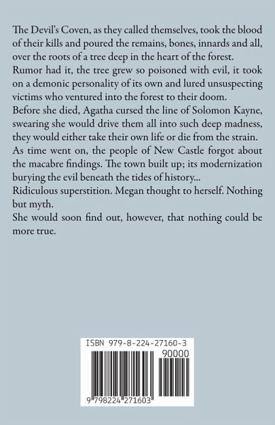 The Devil's Coven, as they called themselves, took the blood of their kills and poured the remains, bones, innards and all, over the roots of a tree deep in the heart of the forest. Rumor had it, the tree grew so poisoned with evil, it took on a demonic personality of its own and lured unsuspecting victims who ventured into the forest to their doom. Before she died, Agatha cursed the line of Solomon Kayne, swearing she would drive them all into such deep madness, they would either take their own life or die from the strain. As time went on, the people of New Castle forgot about the macabre findings. The town built up; its modernization burying the evil beneath the tides of history... Ridiculous superstition. Megan thought to herself. Nothing but myth. She would soon find out, however, that nothing could be more true.