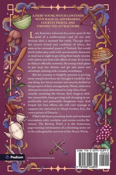 A fiery young witch contends with magical adversaries, courtly fights, and unexpected attractions in this romantasy set in the world of the House Witch. Lady Katarina Ashowan has never quite fit the mold of a noblewoman-and it's not only because she's a mutated fire witch. Though she's the closest friend and confidant of Alina, the soon-to-be-coronated queen of Troivack, Kat would much rather play cards with questionable characters or steal out at night to go riding than bandy niceties with suitors and deal with affairs of state. So as soon as Alina is officially crowned, the young witch plans to put away her dresses and get into some real adventure, training with a master swordsman. But her journey to knightly prowess is proving more complicated than she thought it would be. For one thing, her future teacher isn't exactly thrilled at the prospect of their arrangement. Worse, unknown adversaries seem determined to stop Alina from actually assuming the throne. Kat's magical abilities, meanwhile, keep growing and changing in unpredictable and potentially dangerous ways. And despite her best efforts, she still can't manage to suppress her attraction to Alina's brother, Eric, the crown prince of Daxaria . . . Filled with heart-pounding duels and enchanted encounters, witty wordplay and swoon-worthy flirtations, The Burning Witch 2 is the humorous, page-turning continuation of a charming series set in the unforgettable universe of the House Witch.