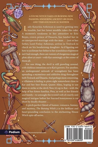 A young witch takes on burning new passions, simmering ancient grudges, and timeless magical mayhem in the last book of this delightful romantasy trilogy. Lady Katarina Ashowan is used to getting into trouble, but her latest muddle takes the cake. A moment's weakness in her attraction to Eric Reyes, crown prince of Daxaria, has landed her in an unexpected marriage with the man . . . just as her father, Lord Finlay Ashowan, arrives in Troivack to check on his headstrong daughter. As if figuring out how to acclimate her father to her scandalous elopement isn't bad enough, there are rumors of dangerous magical plots afoot at court-with Kat seemingly at the center of them all. For one thing, the devil is still prowling around, with dubious intentions as to Kat's powers. For another, an underground network of wrongdoers has been spreading a mysterious and addictive drug throughout both Troivack and Daxaria. And perhaps most concerning, a villainess is hiding in plain sight somewhere close to Kat and her best friend, Queen Alina, hoping to use them to strike at the devil. Now it's up to Kat-with the help of her kitten familiar, Pina, as well as her friends and family-to untangle the twisted web of courtly and magical intrigue before her hurried honeymoon is cut short by deadly disaster . . . A pitch-perfect blend of humor, romance, fantasy, and mystery, The Burning Witch 3 is the brilliant and heart-pounding conclusion to the enchanting House Witch spin-off series.