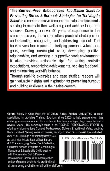 "The Burnout-Proof Salesperson: The Master Guide to Preventing Stress & Burnout- Strategies for Thriving in Sales' is a comprehensive resource for sales professionals seeking to maintain their well-being and achieve long-term success. Drawing on over 40 years of experience in the sales profession, the author offers practical strategies for understanding, recognizing, and addressing burnout. The book covers topics such as clarifying personal values and goals, seeking meaningful work, developing positive relationships, and creating a supportive work environment. It also provides actionable tips for setting realistic expectations, recognizing achievements, seeking feedback, and maintaining work-life balance. Through real-life examples and case studies, readers will gain valuable insights and inspiration for preventing burnout and building resilience in their sales careers.