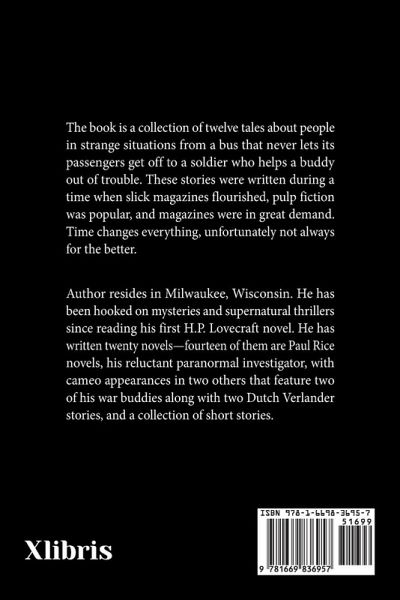 The book is a collection of twelve tales about people in strange situations from a bus that never lets its passengers get off to a soldier who helps a buddy out of trouble. These stories were written during a time when slick magazines flourished, pulp fiction was popular, and magazines were in great demand. Time changes everything, unfortunately not always for the better.