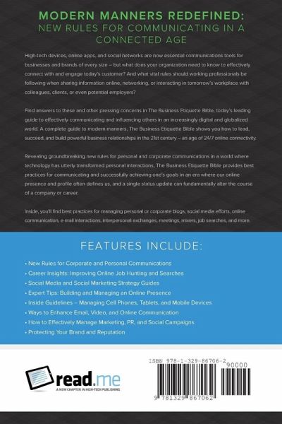 High-tech devices, cloud apps, and social networks are now vital communications tools _ but what does your business need to know to successfully connect with todayÍs customer, and manage its online reputation? And what key rules should working professionals follow when interacting, sharing info, or job hunting online? You'll find answers in The Business Etiquette Bible - a complete guide to modern manners, which reveals how to effectively communicate with + engage others online. Providing new rules for personal and corporate communications, it offers best practices for connecting in an era where our online presence defines us, including crucial insights for managing websites, blogs, social media efforts, marketing/ad campaigns, e-mails, job searches and more. Features: ¿ New Rules for Online Communications ¿ Public Relations (PR), Social Media, and Marketing Strategy Guides ¿ Online Career/Job Hunting Tips ¿ Expert Advice: Managing an Online Reputation ¿ High-Tech Etiquette Primers