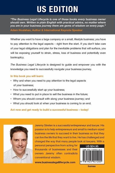 Whether you want to have a large company or a small, lifestyle business; you have to pay attention to the legal aspects – right from the start. The Business Legal Lifecycle US Edition is designed to guide and empower you with the knowledge you need to successfully navigate your business journey. If you don’t take care of your legal obligations and plan for the inevitable problems that will surface, you will be exposing yourself to strain, stress, loss of business and potentially even bankruptcy. In this book you will learn: • Why and when you need to pay attention to the legal aspects of your business; • How to successfully start up your business; • What you need to put in place to sell the business in the future; • Whom you should consult with along your business journey; and • What you should look at when your business is coming to an end. Act now and get ready to build a successful business – today!
