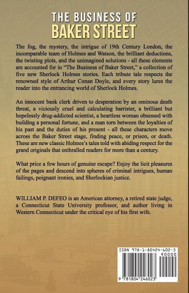 The fog, the mystery, the intrigue of 19th Century London, the incomparable team of Holmes and Watson, the brilliant deductions, the twisting plots, and the unimagined solutions - all these elements are accounted for in "The Business of Baker Street," a collection of five new Sherlock Holmes stories. Each tribute tale respects the renowned style of Arthur Conan Doyle, and every story lures the reader into the entrancing world of Sherlock Holmes. An innocent bank clerk driven to desperation by an ominous death threat, a viciously cruel and calculating barrister, a brilliant but hopelessly drug-addicted scientist, and a heartless woman obsessed with building a personal fortune, and a man torn between the loyalties of his past and the duties of his present - all these characters move across the Baker Street stage, finding peace, or prison, or death. These are new classic Holmes's tales told with abiding respect for the grand originals that enthralled readers for more than a century. What price a few hours of genuine escape? Enjoy the licit pleasures of the pages and descend into spheres of criminal intrigues, human failings, poignant ironies, and Sherlockian justice.
